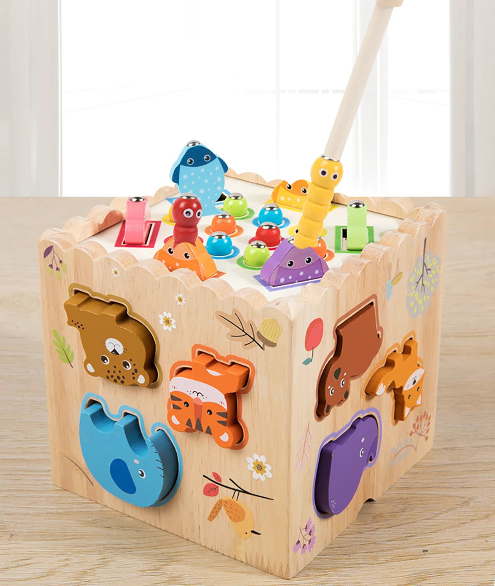 Dit prachtige houten vormensorteerspel is geïnspireerd op de Montessori-methode en speciaal ontworpen om peuters op een speelse manier vormen te leren herkennen en hun fijne motoriek te ontwikkelen.
